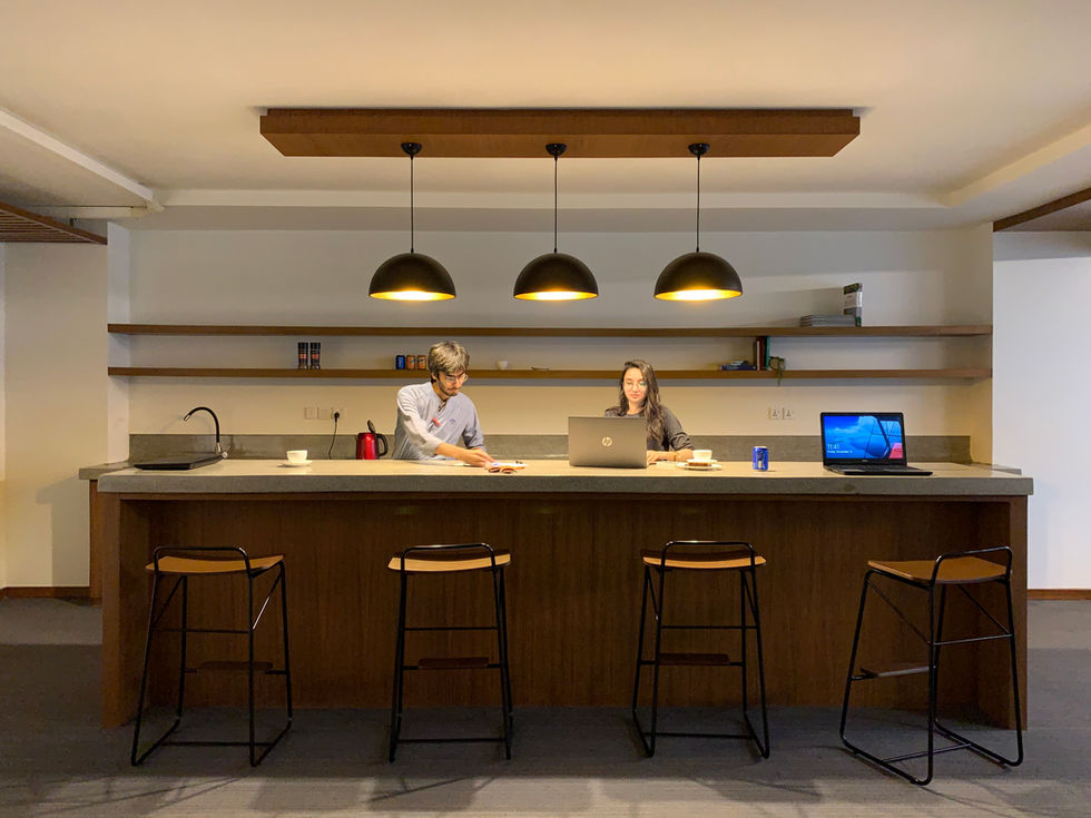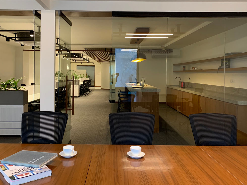 A neutral colour palette infused with textures of wood, terrazzo and foliage helped in creating a comforting and energising work environment. The space is characterized by a distinct circulation path flanked by workstations and meeting rooms on either ends. The Oak rafters suspended from the ceiling lead the user to the hearth of the office; a dynamic space where a terrazzo counter-top serves as an island for conversation, meals and collective work.