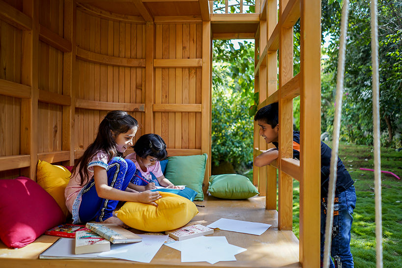 This simple structure is designed using minimal materials to create an atmosphere of openness and play. Using a concrete pad for the foundation, hemlock wood and plyboards for the structure and floor levels, rope for a climbing wall and swing, sand for the base floor, and local khaddar fabric (hand-woven natural fiber cloth) for the soft furnishings.